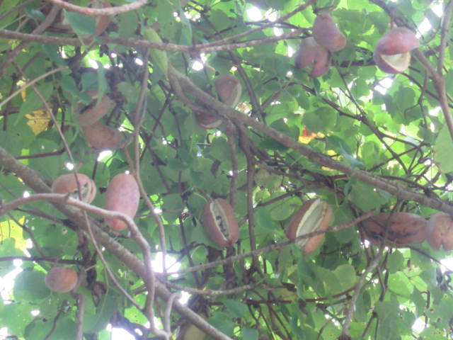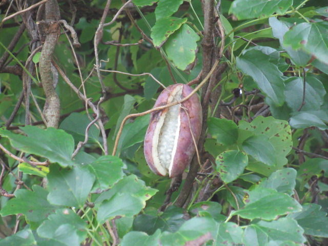 グラウンド周辺にアケビの実がたわわに実っています 熟すと白くて甘い果肉と黒い種子が顔を出します 秋のご馳走です