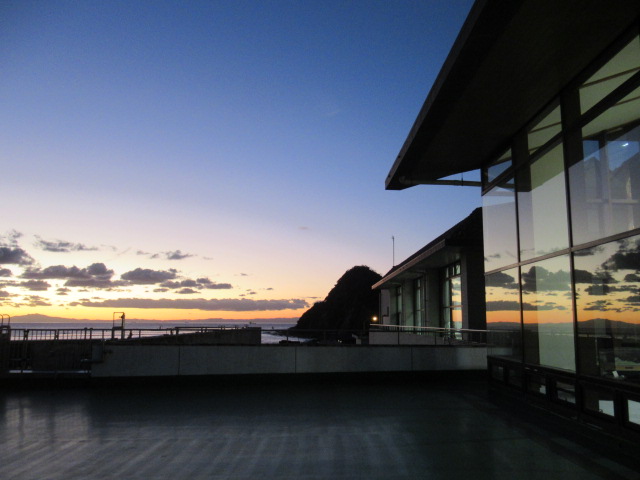日没後の薄明の時間帯のマジックアワー 太陽からの光線が日中より柔らかく金色から青く輝いて見える時間です 2階ロビーのガラスに屏風絵のように映って美しい夕暮れ時を飾ってくれます 12月22日の冬至までますます日の入りが早くなります 12月6日 日の入16時28分