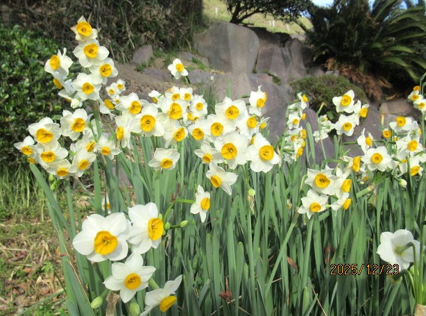 ロックガーデンの下に水仙の花が咲き始めました 冬至も過ぎ遅めの開花です 今年もあとわずか よいお年をお迎えください