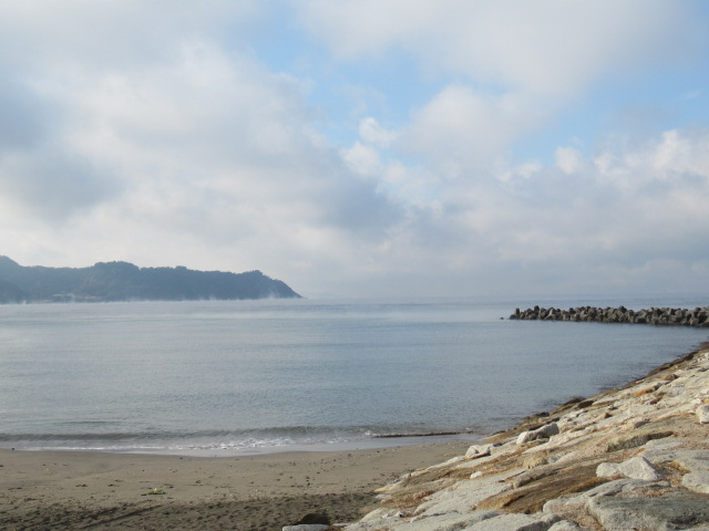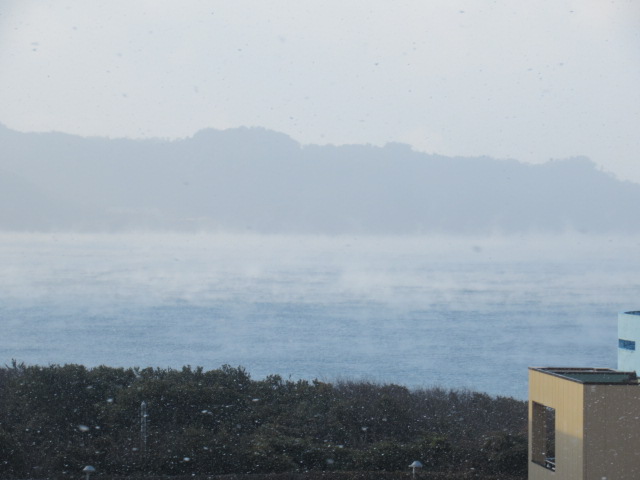 早朝雪が舞う中 海を見ると海面から湯気が立っていました 気嵐(けあらし)です 昨日からの冷え込みで海面近くの空気が冷えたのでしょう 珍しく幻想的な現象です